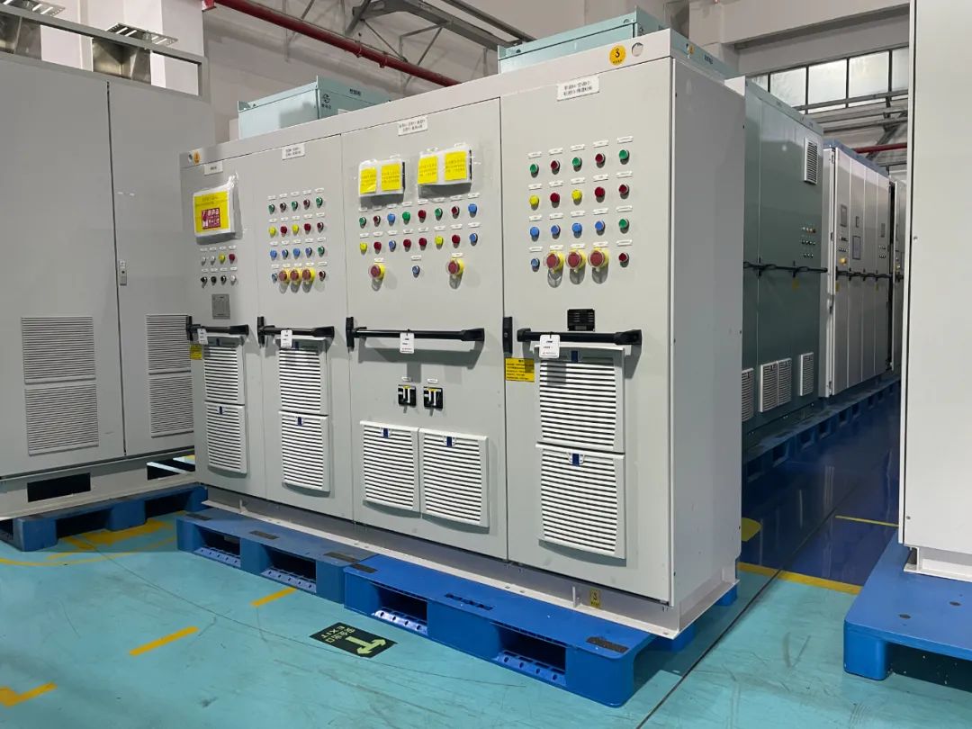 該船動(dòng)力來(lái)源為常規(guī)柴油推進(jìn)主機(jī),系統(tǒng)配置一臺(tái)350kW的軸帶發(fā)電機(jī),軸帶電機(jī)通過(guò)齒輪箱與主機(jī)自由端相連接,確保主機(jī)在正常使用轉(zhuǎn)速范圍內(nèi),系統(tǒng)能夠發(fā)出足夠的功率,供應(yīng)全船負(fù)荷。目前變頻電控設(shè)備已發(fā)至客戶指定地點(diǎn)。