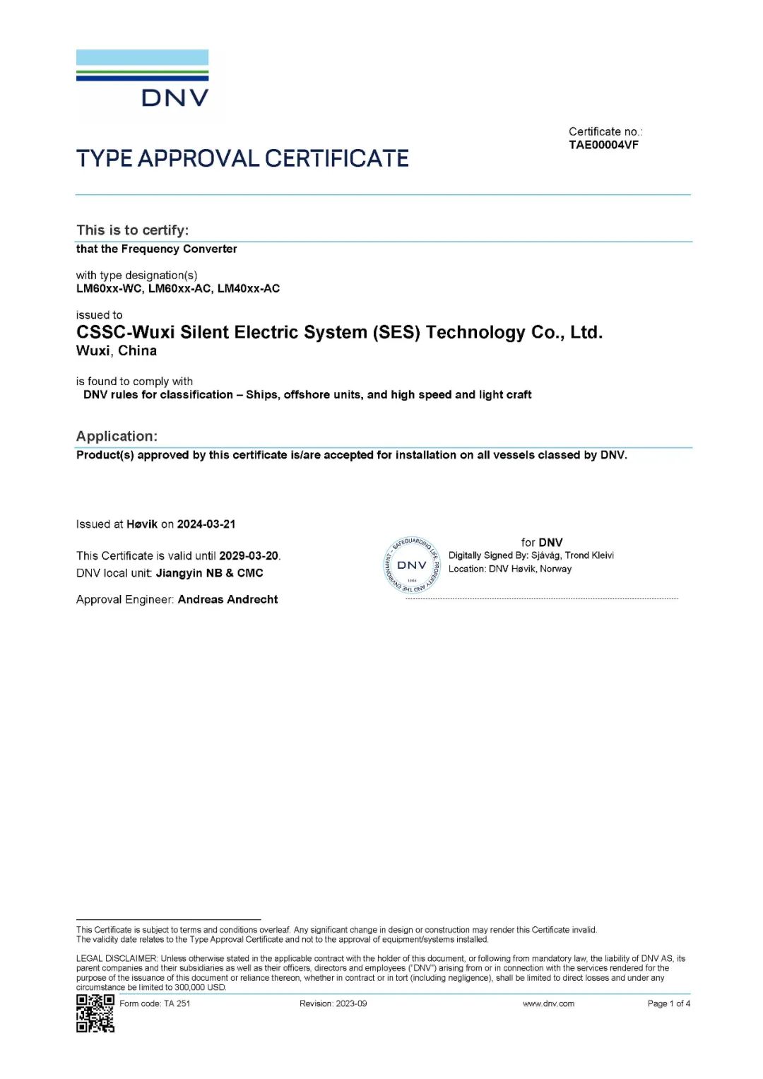 2024年3月21日,中船賽思億(無錫)電氣科技有限公司核心變頻電控設(shè)備順利取得挪威船級社(DNV)型式認(rèn)可證書,成為國內(nèi)首家取得挪威船級社(DNV)型式認(rèn)可證書的國產(chǎn)船舶電力推進(jìn)企業(yè),對賽思億的海外市場開拓具有里程碑意義。