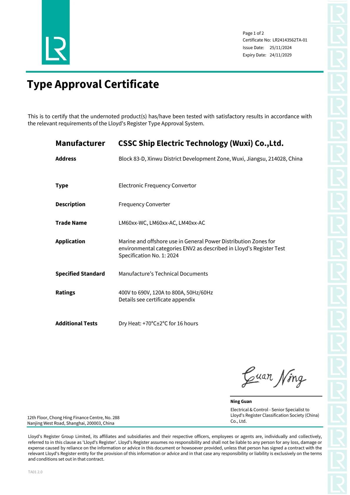2024年11月25日,中船賽思億(無(wú)錫)電氣科技有限公司(CSSC Ship Electric Technology ( Wuxi) Co.,Ltd.)核心變頻電控設(shè)備順利取得英國(guó)勞氏船級(jí)社(LR)型式認(rèn)可證書(shū),成為國(guó)內(nèi)為數(shù)不多的取得英國(guó)勞氏船級(jí)社(LR)型式認(rèn)可證書(shū)的船舶電力推進(jìn)企業(yè)。目前中船賽思億已取得CCS、BV、RINA、DNV、LR等五大國(guó)際主流船級(jí)社型式認(rèn)可證書(shū),是目前國(guó)內(nèi)唯一一家擁有五大船級(jí)社型式認(rèn)可證書(shū)的國(guó)產(chǎn)船舶電力推進(jìn)企業(yè),對(duì)中船賽思億的海內(nèi)外市場(chǎng)開(kāi)拓和國(guó)際化發(fā)展進(jìn)程,具有重要意義。