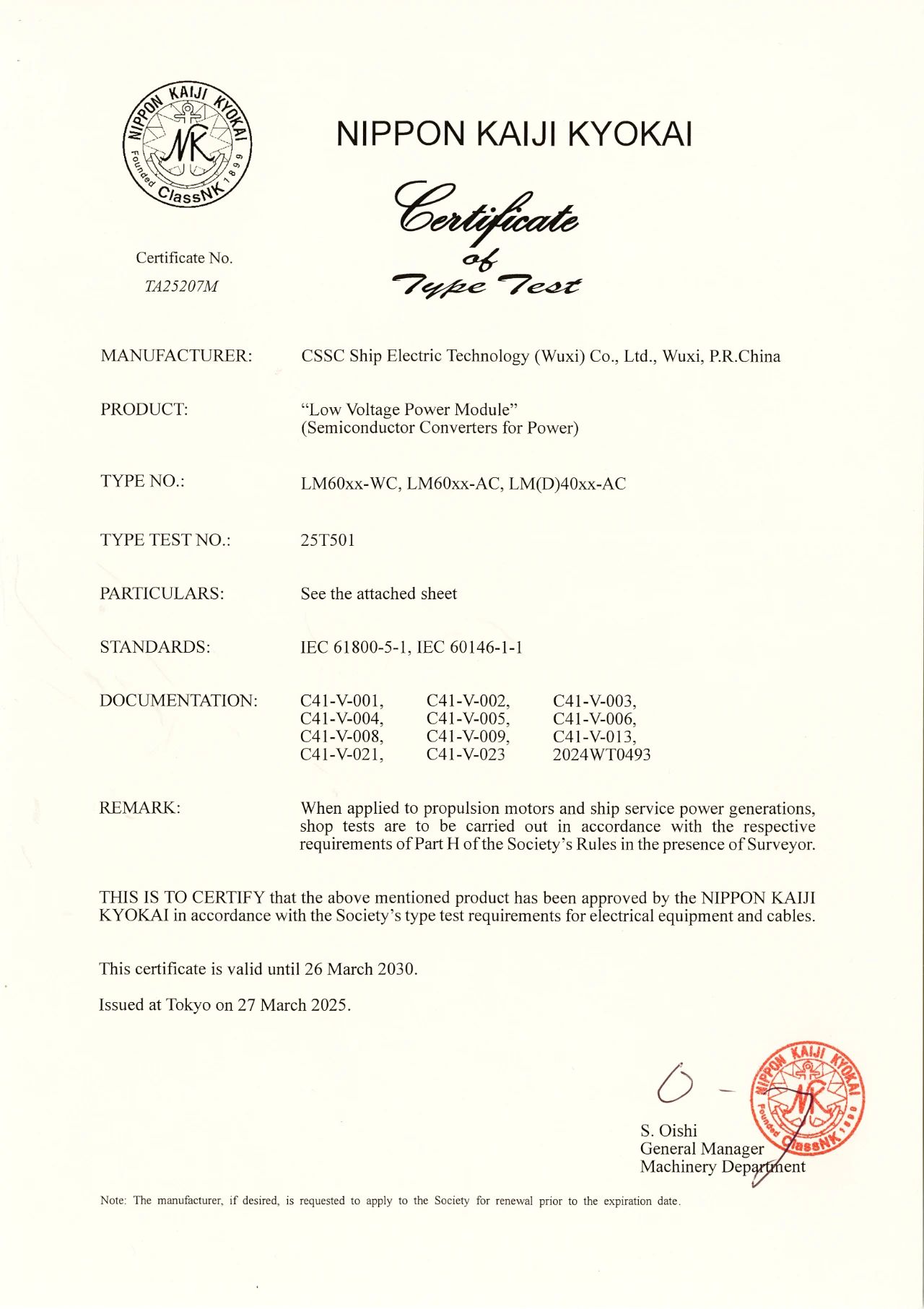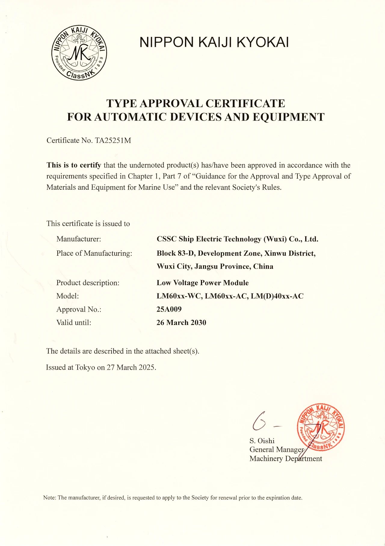 2025年3月27日,中船賽思億(無錫)電氣科技有限公司(CSSC Ship Electric Technology ( Wuxi) Co.,Ltd.)核心變頻電控設(shè)備順利取得日本船級(jí)社(NK)型式認(rèn)可證書,成為國內(nèi)為數(shù)不多的取得日本船級(jí)社(NK)型式認(rèn)可證書的船舶電力推進(jìn)企業(yè)。目前中船賽思億已取得CCS、BV、RINA、DNV、LR、ABS、NK等七大國際主流船級(jí)社型式認(rèn)可證書,是目前國內(nèi)唯一一家擁有七大船級(jí)社型式認(rèn)可證書的國產(chǎn)船舶電力推進(jìn)企業(yè),對(duì)中船賽思億的海內(nèi)外市場開拓和國際化發(fā)展進(jìn)程,具有重要意義。
