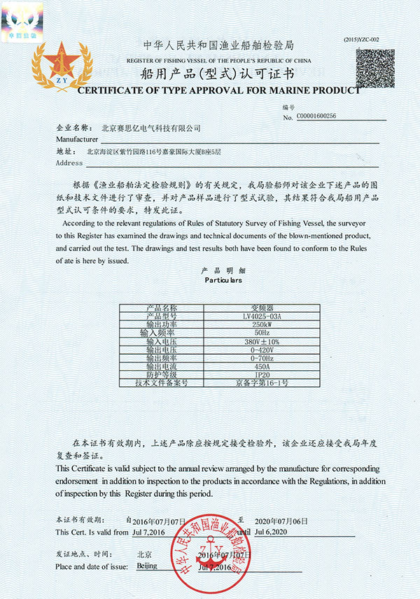 “浙漁科2”號柴電混合動力系統(tǒng)變頻器船檢及漁檢證書